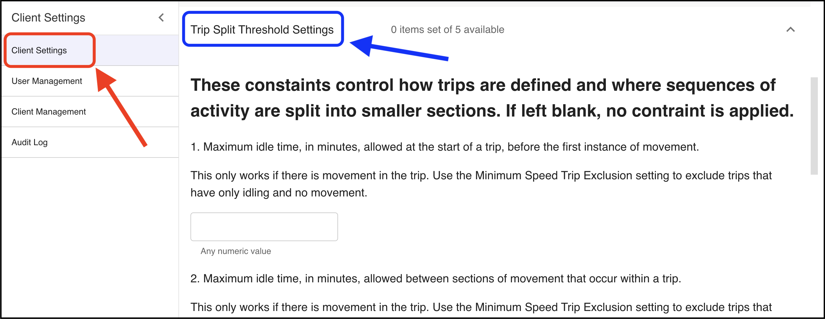Under Client Settings, scroll down until you see Trip Split Threshold Settings.