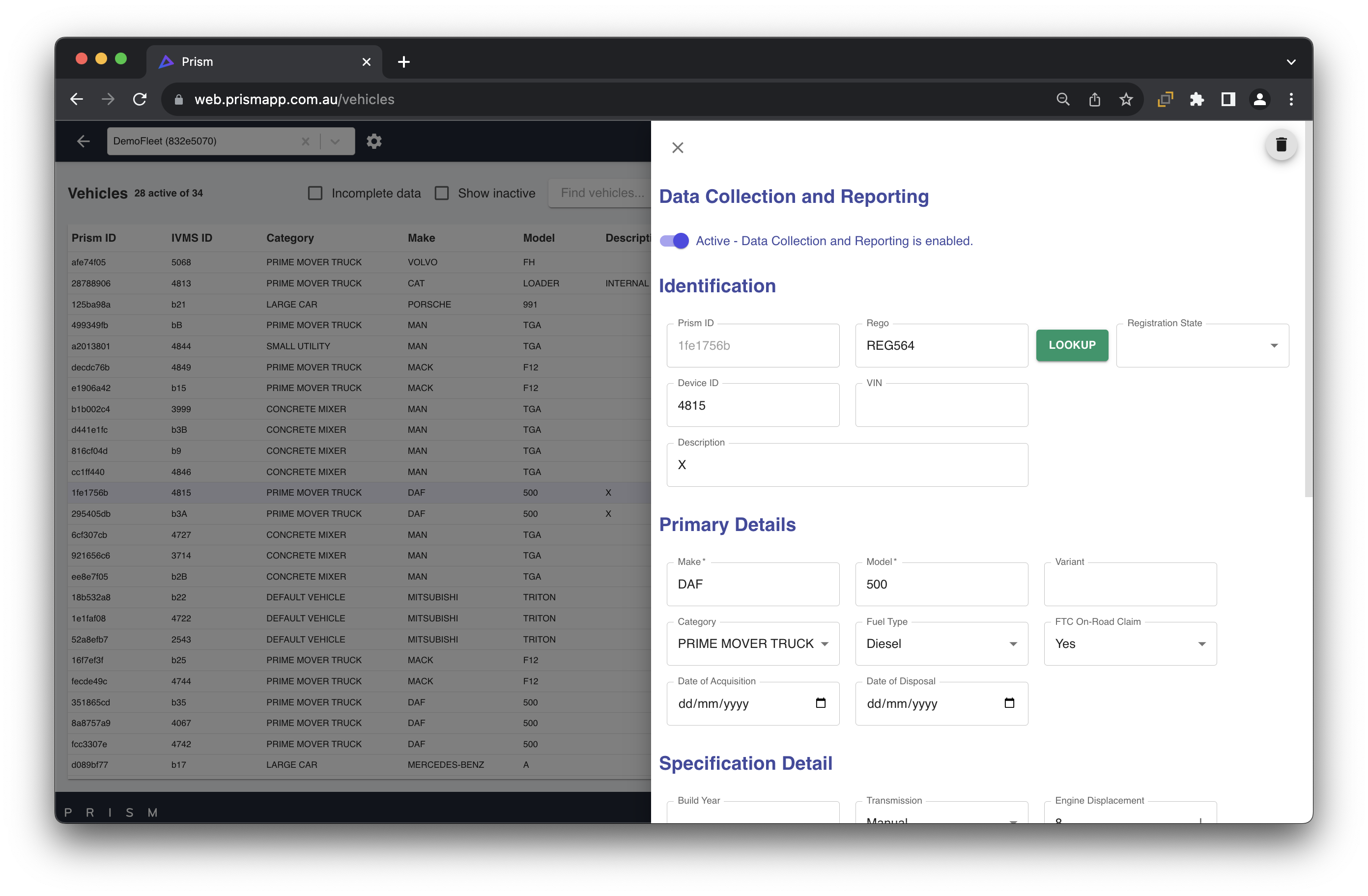 Enter all of the vehicle specifications that you have for your vehicle. *Important Never change the IVMS ID or the Prism ID. These IDs are used by Prism to assign the activity received from your telematics provider.
