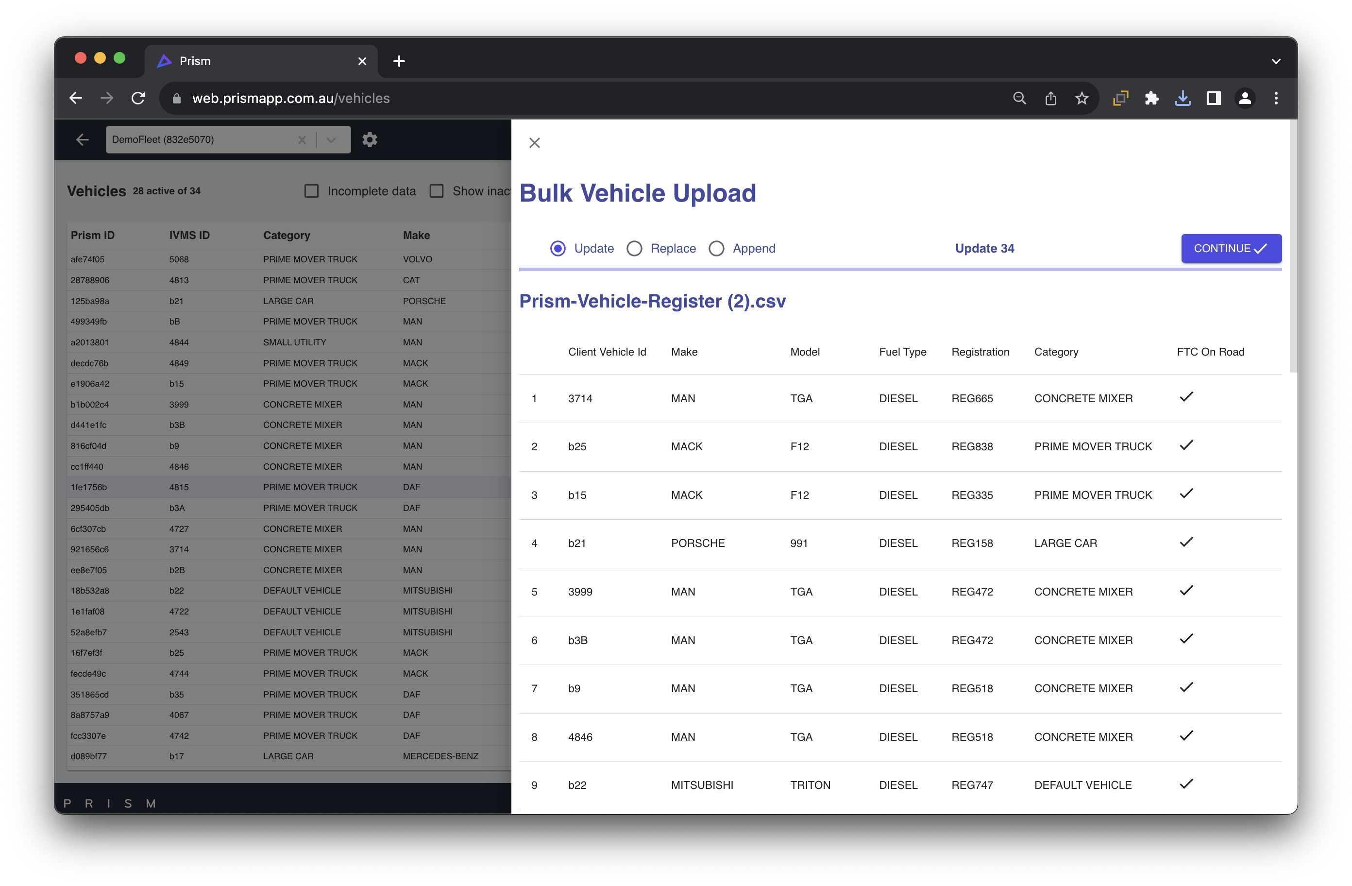 The Prism vehicle register will also allow you to configure your vehicles via bulk upload.