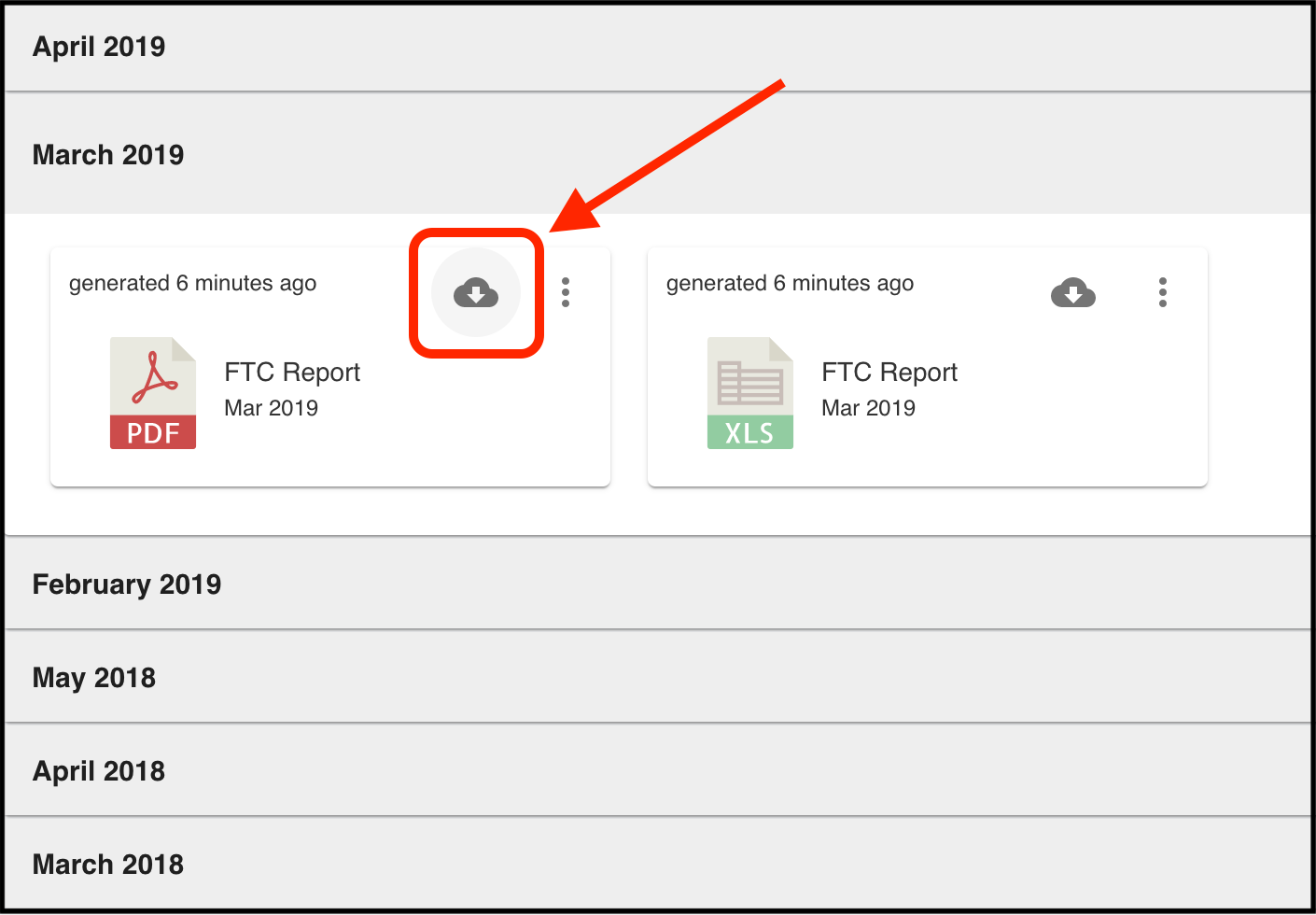 To do that, hover your mouse to the cloud icon next to the three dots and click on it. This will immediately download the report of your format choosing. However, if you wish to download both PDF and Excel, you will need to download each separately:
