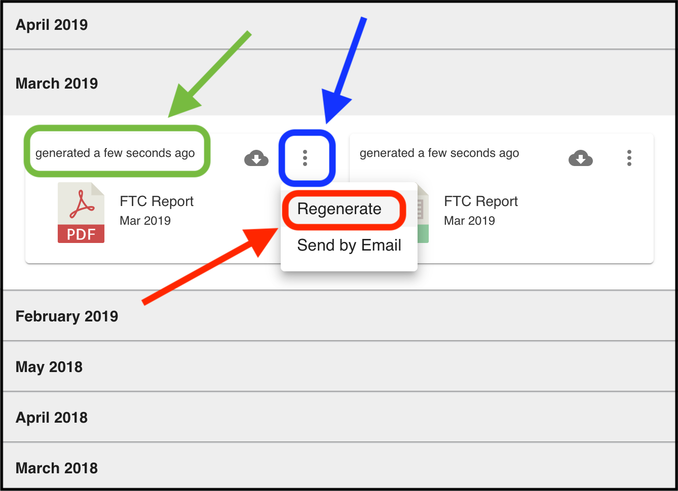 To regenerate the reports, hover your mouse to the three dots (highlighted in blue) and select ‘Regenerate’ (highlighted in red). You will need to do this for both the PDF and Excel reports.