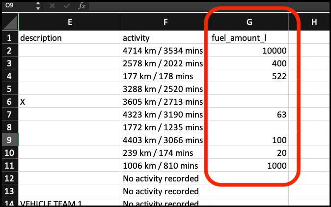 Within the opened .csv file, please enter any fuel records that you wish to upload in column G. If needed, you can also overwrite any existing fuel records (for example, you could change cell G2 from 10000 to 11000).