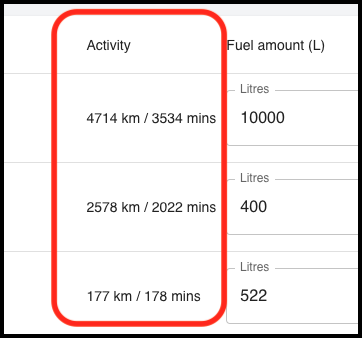 Enter the purchased fuel under Fuel amount (L) next to each vehicle.