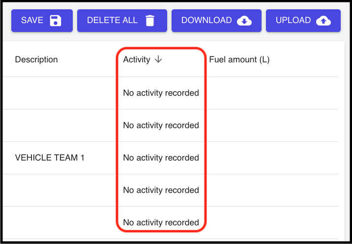 PLEASE NOTE: It is important to understand that you cannot upload any fuel amount/s against any vehicle/s where it mentions ‘No activity recorded’ in column F.