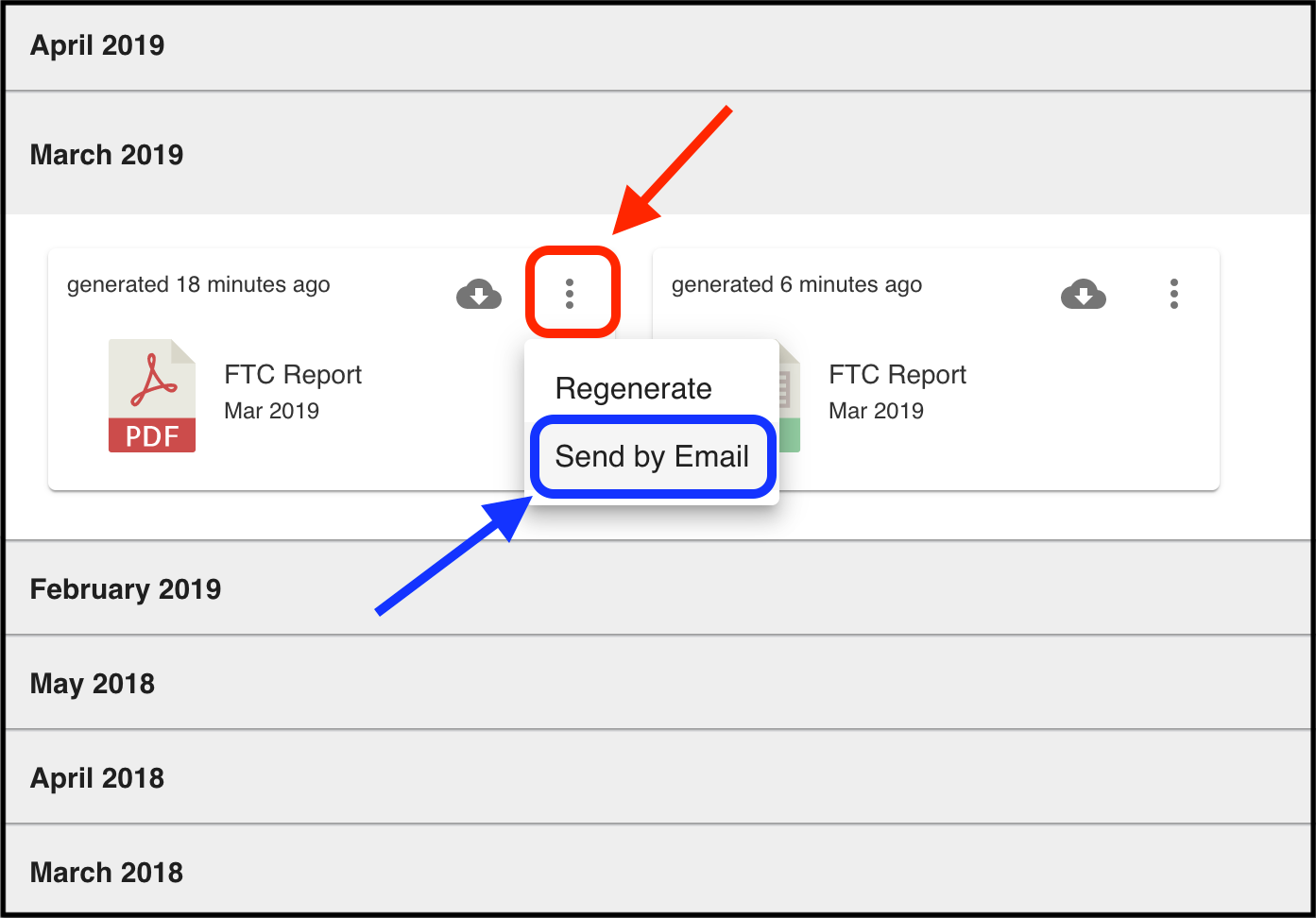 To do so, hover your mouse to the three dots (highlighted in red) and select ‘Send by Email’ (highlighted in blue). You will need to do this for both the PDF and Excel reports: