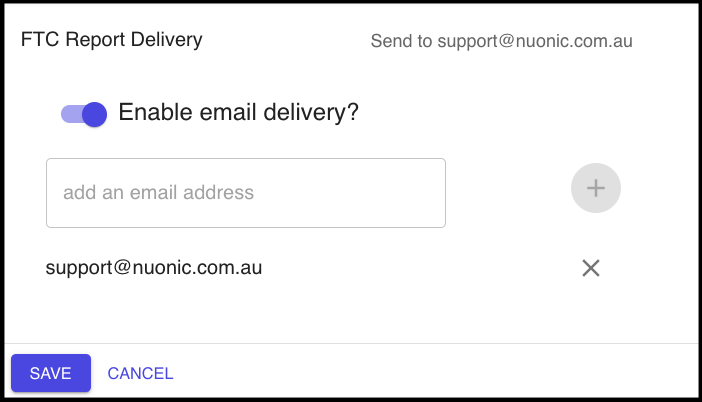 From here, go to FTC Report Delivery where you will see fields to edit which email address/es will receive the monthly Prism reports (Screenshot 3 - FTC Report Delivery).
