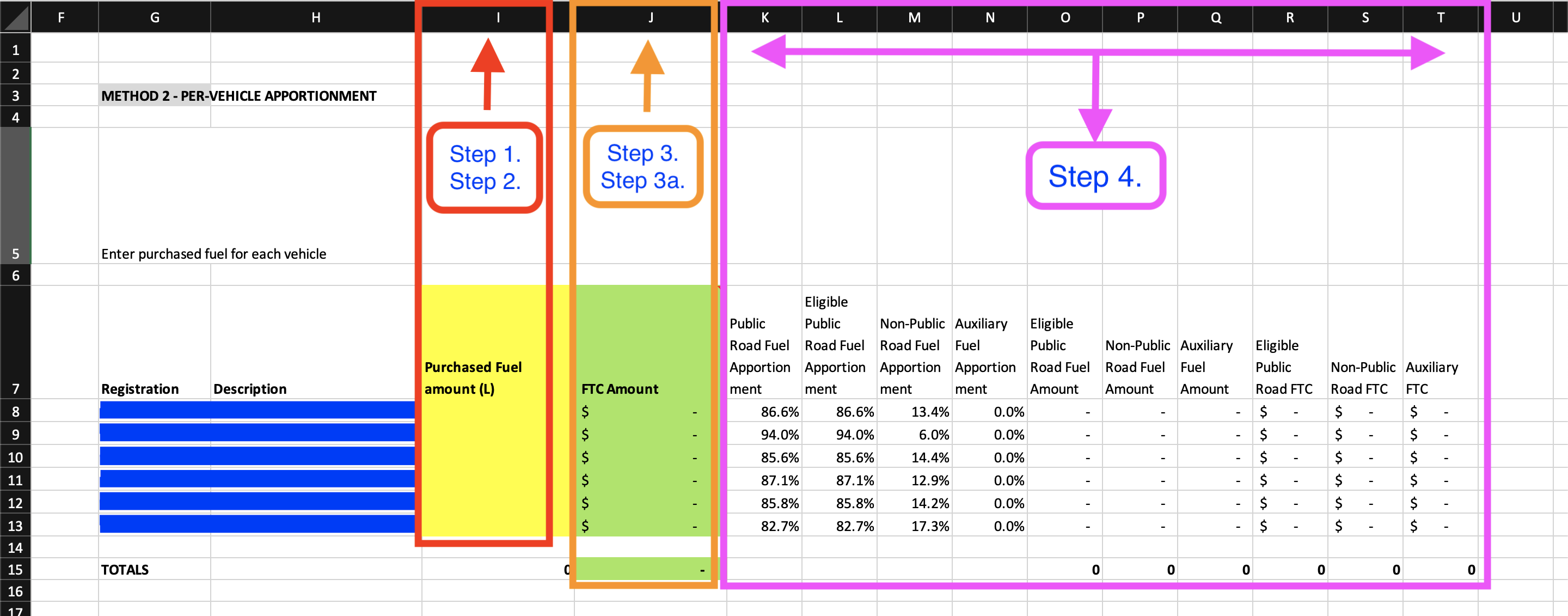 From there, use each of the cells in column I to enter the total litres for each vehicle as listed. This can be found under Purchased Fuel amount (L).